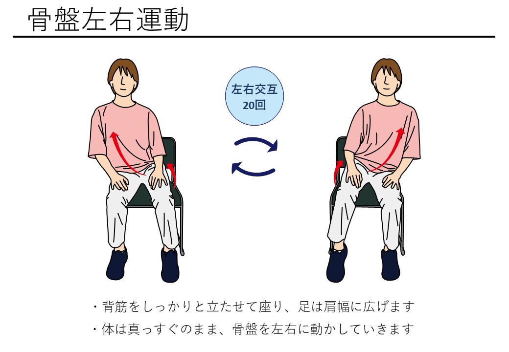 - 骨盤左右運動:椅子に座った状態で、骨盤を左右にゆっくり傾ける動作。
