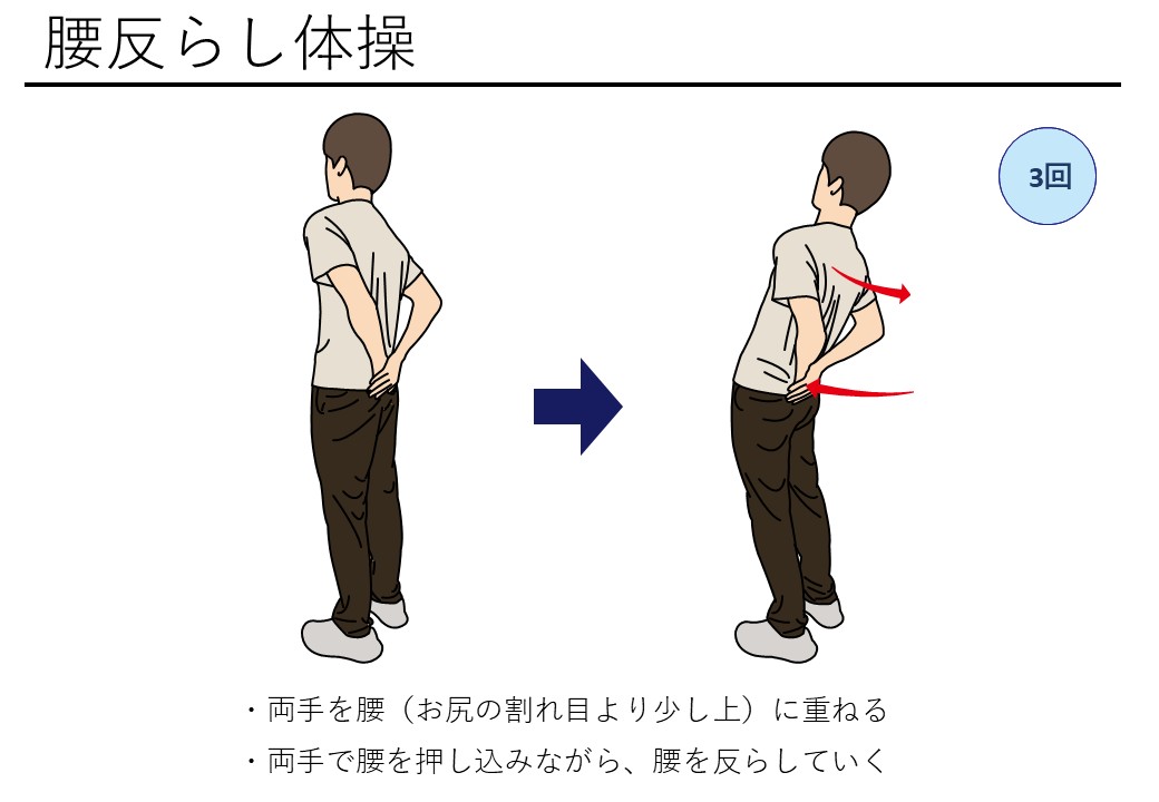 - 腰回しストレッチ:肩幅に足を開いて立ち、腰をゆっくり左右に大きく回します(各方向5回)。