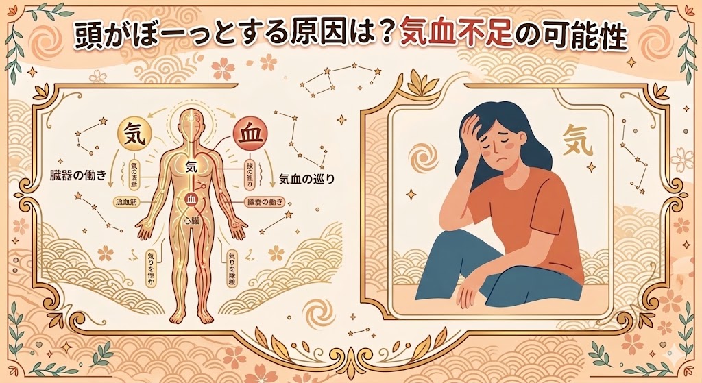 この巡りが弱くなると、脳にも十分なエネルギーが届きにくくなり、頭がぼーっとする感覚が起きやすくなるのです。