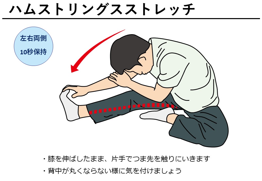 - 前屈ストレッチ:立ったままゆっくり前に倒れて背中を伸ばす