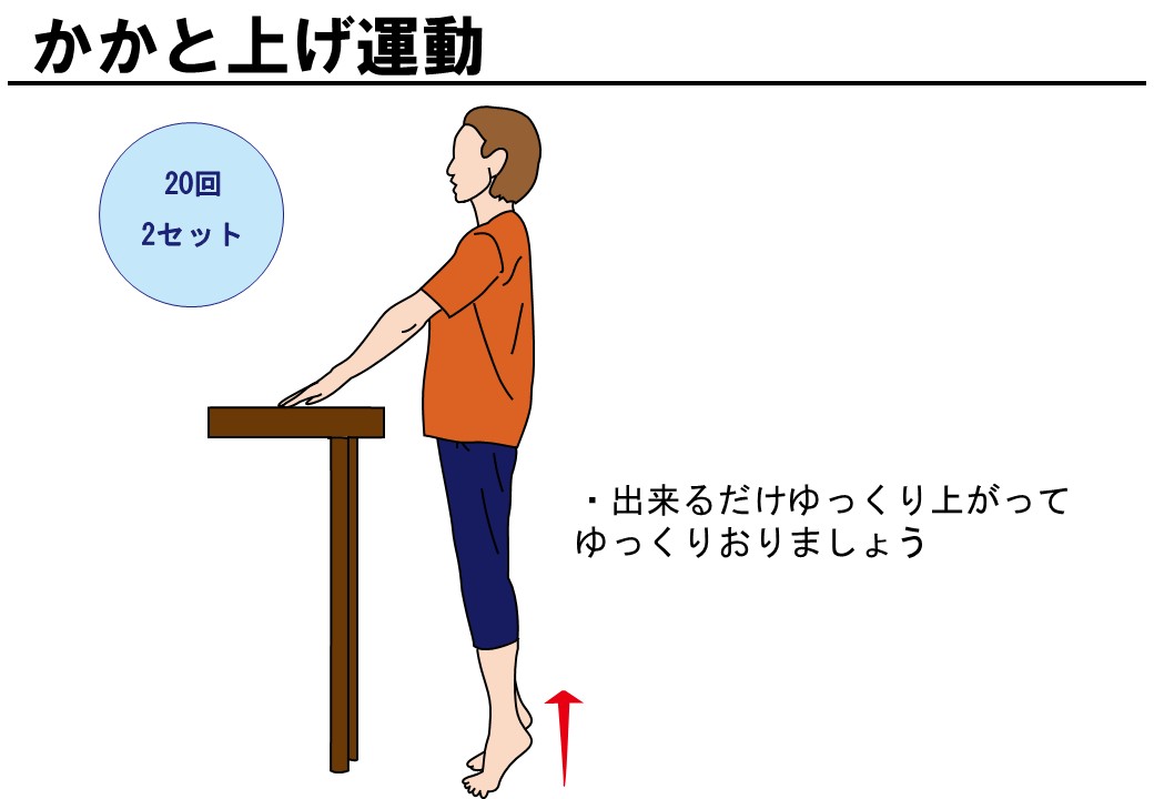 - かかと上げ運動:立ってゆっくり20回×2セット