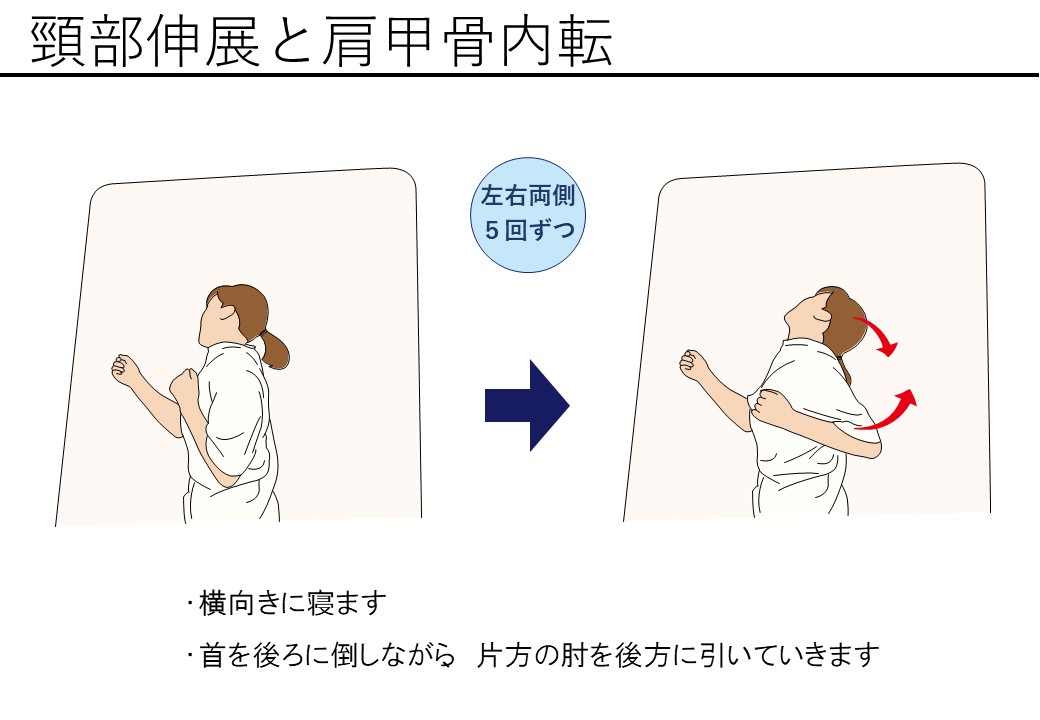 - 首ゆらし:首を左右にゆっくり倒し、血流改善(各5回)