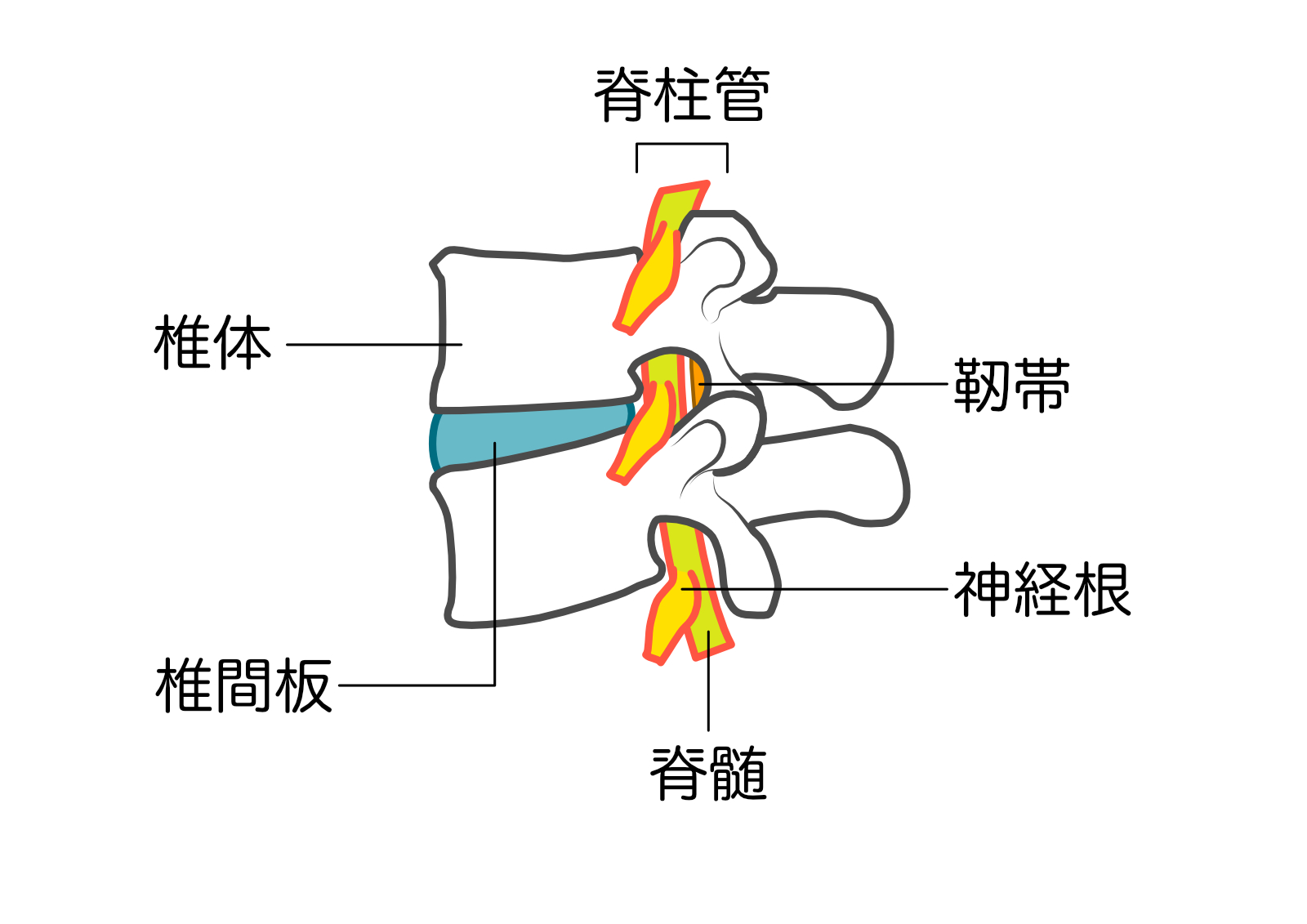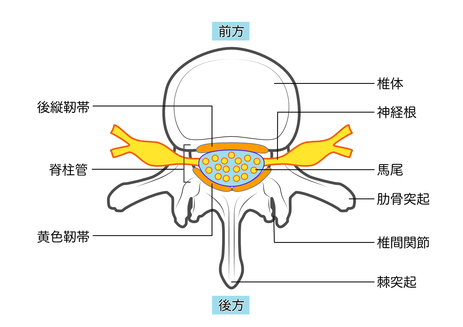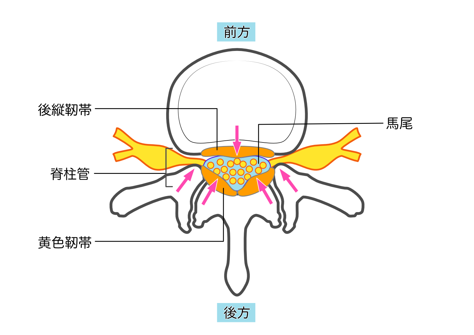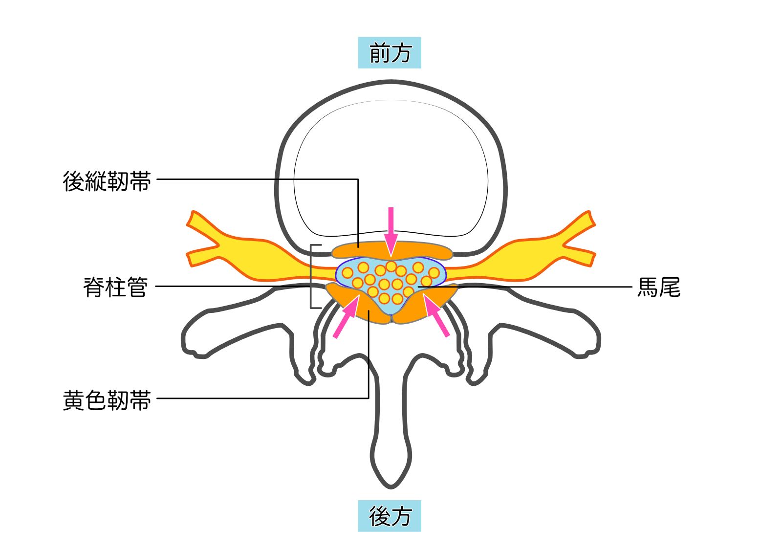 特徴: 脊柱管の中心を通る「馬尾神経」が圧迫されます。